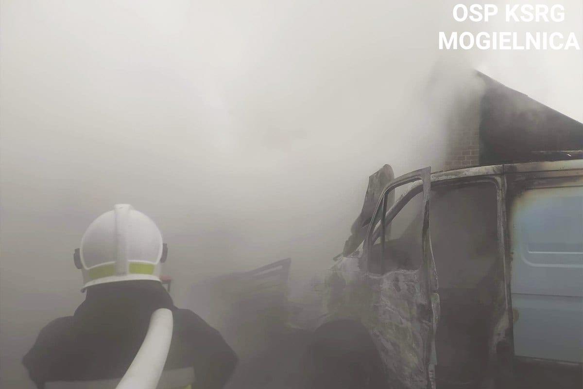 W momencie przyjazdu straży bus już w całości płonął, natomiast od samochodu zajął się ogniem budynek gospodarczy. Niezwłocznie przystąpiono do gaszenia budynku.