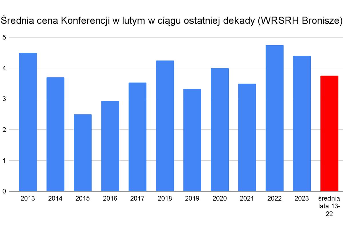 Ceny hurtowe Konferencji w lutym tego roku są wyższe od średniej (z tego miesiąca) z ostatniej dekady. 10 lat temu te same ceny były wyjątkowo atrakcyjne, dziś są dobre.