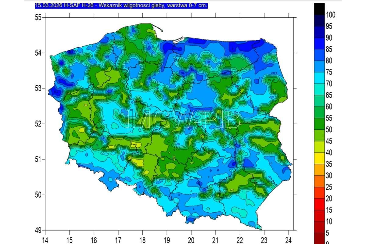 Za krytyczny poziom wilgotności, który wyznacza suszę glebową, często uznaje się spadek wilgotności poniżej 30%. Jak widzimy, w pierwszych dwóch tygodniach marca ten warunek niestety był spełniony w większości zagłębia grójeckiego.