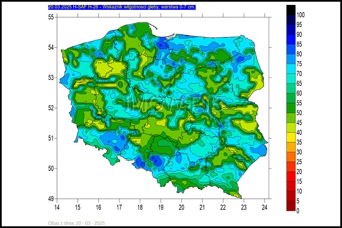 Poniższa grafika została przygotowana przez IMGW (Satelitarne Centrum Aplikacyjne). Pokazuje wilgotność gleby na poziomie 0-7 cm. Zgodnie z mapą, wilgotność w zagłębiu grójeckim wynosi około 50%. W głębszych warstwach gleby jest nawet nieco wyższa. Słowem, nie ma zagrożenia suszą...
