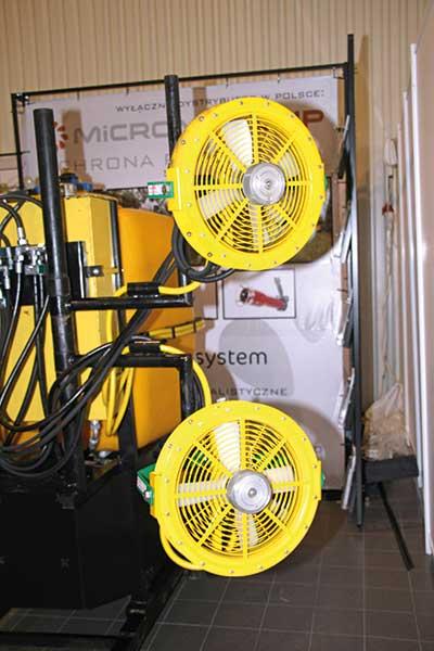 Firma Micro-System z Dobrodzienia prezentowała Turbofan (fot. 1) – opryskiwacz z kierunkowym, wspomagającym strumieniem powietrza, w którym zastosowano technologię CDA (Controlled Droplet Application), czyli oprysku kroplą kontrolowaną. Podczas zabiegu wykorzystuje się opracowaną w firmie Micron w Wielkiej Brytanii technologię polegającą na użyciu rozpylaczy rotacyjnych (atomizera z obrotowym dyskiem). Dysk, obracając się, rozbija ciecz roboczą na jednorodne krople o podobnej wielkości, w wyniku czego zmniejsza się zużycie cieczy roboczej i preparatu na ha. Opryskiwacz rotacyjny nie wymaga ciśnienia w obwodzie (ma praktycznie bezciśnieniową konstrukcję), co sprawia, że jest szczególnie przydatny podczas stosowania biopreparatów (np. zawierających mikroorganizmy), które w tradycyjnych ciśnieniowych opryskiwaczach mogą ulec zniszczeniu. Prezentowany opryskiwacz wyposażony był w zbiornik o pojemności 400 l i w 4 siatkowe atomizery z obrotowym dyskiem, w których łopatki wentylatora napędzane były osobnymi silnikami hydraulicznymi zasilanymi własną instalacją hydrauliczną (w sadzie o wysoko wyprowadzonych koronach można zastosować 6 atomizerów). Wydatek powietrza jednego atomizera wynosi 98m3/min, a prędkość powietrza 18 m/s.