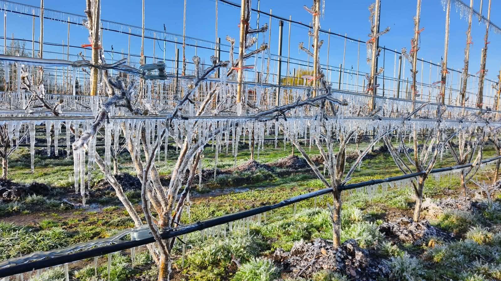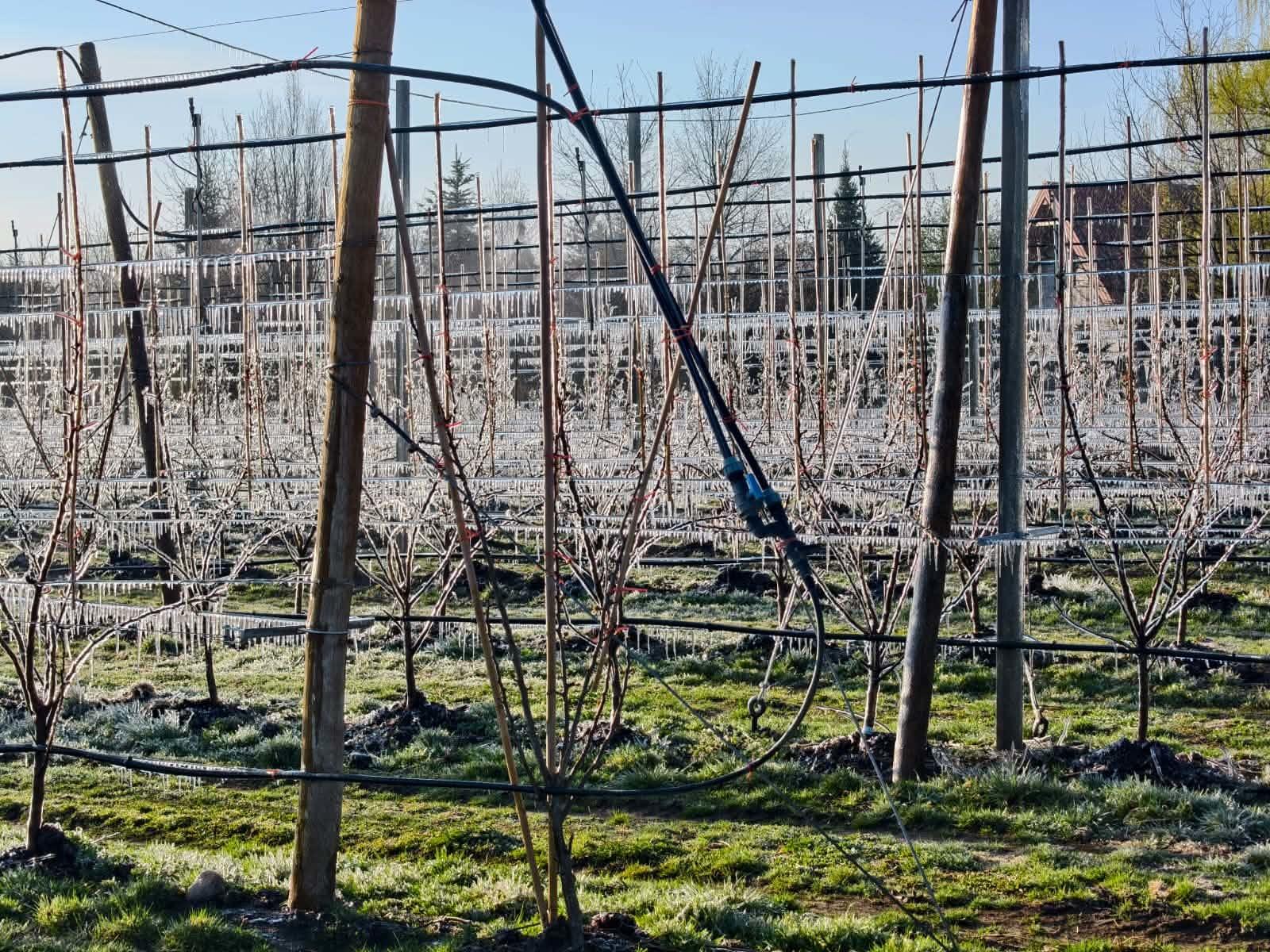 Noc z 11 na 12 kwietnia 2026 roku znów była dla sadowników bardzo pracowita. Drzewa są po mroźnej zimie, panuje susza, a to już kolejna noc z przymrozkami. W Zalesiu walka trwała całą noc. Kiedy pan Michał Kot relacjonował nam jej przebieg, po godz. 7:00 zraszanie nadal pracowało. Sadownik wyłączy instalację dopiero, kiedy lód się rozpuści.