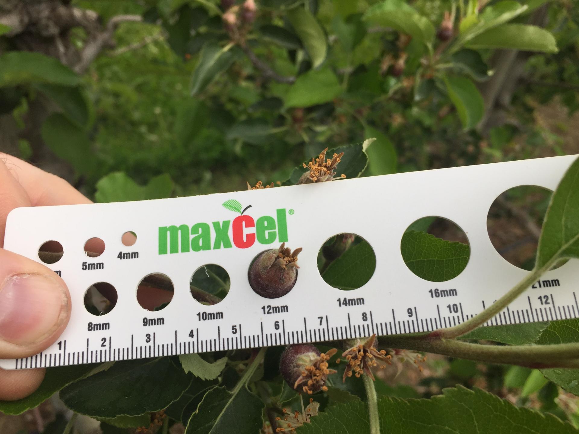 Biorąc powyższe pod uwagę, można spodziewać się również większego opadu czerwcowego zawiązków owoców, zwłaszcza w tych sadach, które doświadczyły uszkodzeń po zimowym i wiosennym mrozie. W takiej sytuacji w obecnym sezonie wegetacyjnym, można raczej przewidywać scenariusz łatwego przerzedzania chemicznego (patrz powyżej pkt. 1, 4, 6, 8, 10 i 11). Dlatego skupiłbym się zdecydowanie na bezpiecznym przerzedzaniu późnym (zawiązki 7-12 mm) lub bardzo późnym (zawiązki 13-16 mm) przy użyciu regulatora wzrostu MaxCel (zawierającego 6-benzyloadaninę – 6BA) - „solo” lub z dodatkiem NAA (zawierającego kwas 1-naftylooctowy). Naturalny hormon roślinny cytokinina, z preparatu MaxCel, działa w roślinie na dwa sposoby: wywołuje stres węglowodanowy (mniejsza ich dostępność dla owoców) poprzez przejściową stymulację wzrostu pędów (przyśpiesza podziały komórkowe) oraz gwałtownie uruchomia produkcję etylenu. W efekcie końcowym powoduje to, że drzewo odbiera wyraźny sygnał do zrzucania zbędnych i niewyrośniętych zawiązków. Po aplikacji przerzedzacza MaxCel nie występuje zbytnie ryzyko nadmiernego przerzedzania podczas pochmurnych dni po zabiegu, tak jak ma to miejsce w przypadku użycia innego preparatu, przerzedzającego w tym okresie. Ryzyko to jest naprawdę minimalne nawet w przypadku słabego zawiązania owoców czy zastosowania górnej rekomendowanej dawki (8,0-10 l/ha). W praktyce, do poprawy efektu przerzedzającego, można stosować MaxCel z innymi środkami do przerzedzania (np. NAA, w dawce 0,1-0,2 l/ha) na odmiany trudno przerzedzające, na zawiązki 7-12 mm, np. GOLDEN DELICIOUS – dodatkowa poprawa kształtu, wydłużone dno kwiatowe – lub innych odmian w fazie zawiązków 13-16 mm. Mieszanina MaxCel + NAA odpowiada dawniejszemu, wycofanemu preparatowi do przerzedzania o nazwie Bioprzerzedzacz 060 SL. Jednak mieszaniny tej nie powinno się stosować na takie odmiany jak: GALA czy SAMPION, ponieważ NAA w temperaturze >22°C będzie pozostawiać na drzewie niewyrośnięte zawiązki tzw. pigmeje, a zastosowany późno będzie wpływał na pogorszenie zdolności przechowalniczej owoców (krótsze przechowywanie). W przypadku odmiany IDARED i odmian na podkładkach silnie rosnących oraz na drzewach starych lub silnie uszkodzonych przez mróz, nie zaleca się stosować produktów z 6-BA.