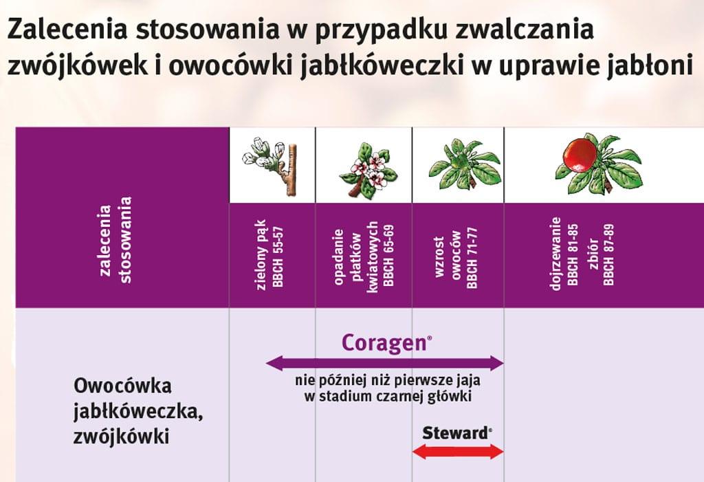 Dopuszczalne jest przeprowadzenie dwóch zabiegów środkiem Coragen® 200 SC w sezonie wegetacyjnym, w odstępie 14 dni, zawsze naprzemiennie z preparatami owadobójczymi o odmiennym mechanizmie działania. W wypadku zwójek liściowych dopuszczone jest użycie preparatu do zabiegu w fazie zielonego pąka lub latem w okresie intensywnego lotu motyli i składania jaj. Dla owocówki jabłkóweczki jest to okres intensywnego lotu motyli pierwszego pokolenia i składania jaj, ale nie później niż w fazie tzw. czarnej główki. Stosując preparat w tym terminie, w efekcie ograniczeniu ulega liczebność drugiego pokolenia owocówki jabłkóweczki oraz populacji innych gatunków motyli, których okres masowego składania jaj następuje w podobnym terminie jak u owocówki jabłkóweczki.