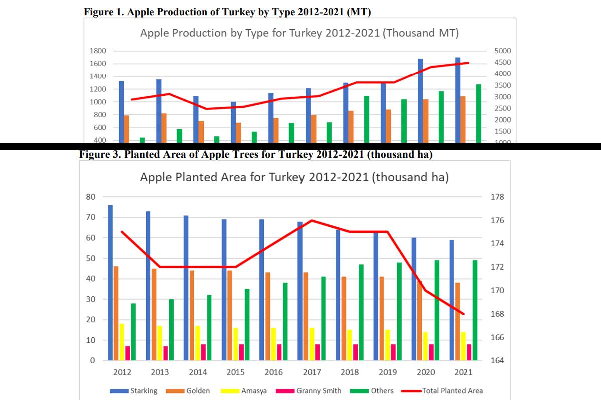 Najistotniejszy jest fakt, że wraz ze spadkiem obszaru uprawy jabłoni (dolny wykres), rośnie krajowa produkcja (górny wykres). To najlepszy dowód na duże inwestycje coraz więcej nowych, wydajnych, karłowych sadów w Turcji.