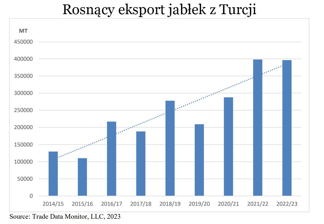 Rosnąca pozycja Turcji w światowym handlu i jabłkami to konkurencja dla jabłek z Polski. Stałe inwestycje w poprawę jakości i wydajności sadów przynoszą skutek w postaci szybkiego wzrostu eksportu. Szacunki mówią, że w tym sezonie wyniesie niemal 400 000 ton. Na wykresie niżej widzimy, że tempo wzrostu jest imponujące…