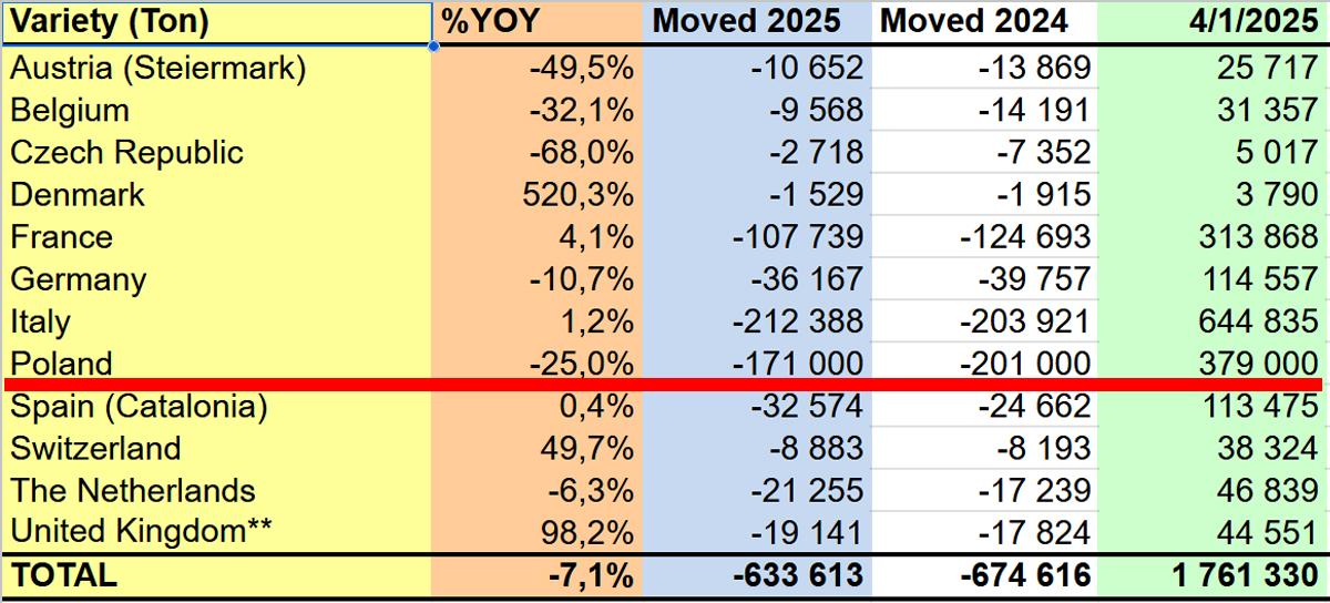 Zgodnie z najnowszymi szacunkami WAPA, czyli dotyczącymi początku kwietnia, w polskich chłodniach było aż o 25% jabłek mniej niż przed rokiem o tej samej porze. Zapasy wynosiły 379 tysięcy ton i były drugie co do wielkości w Europie.