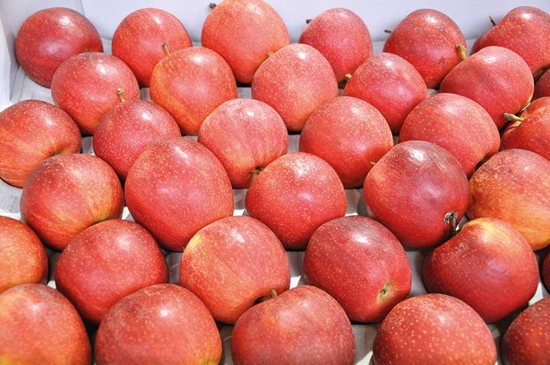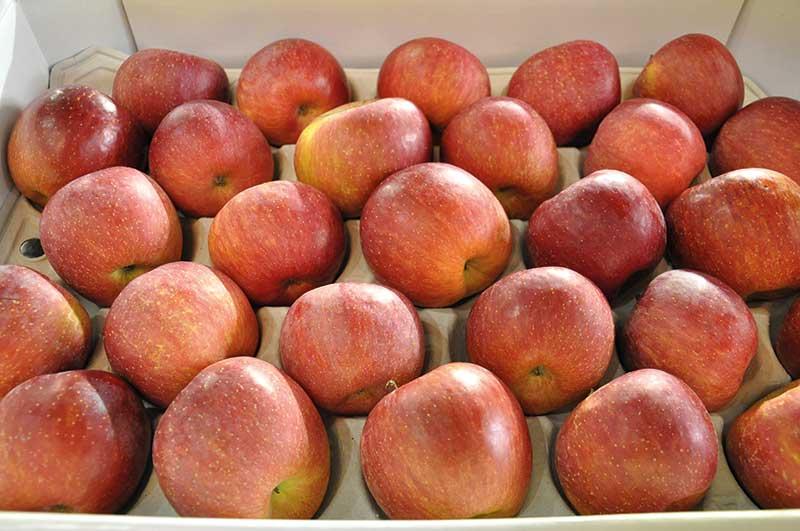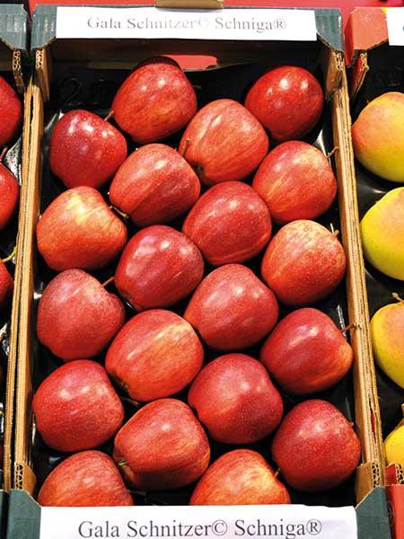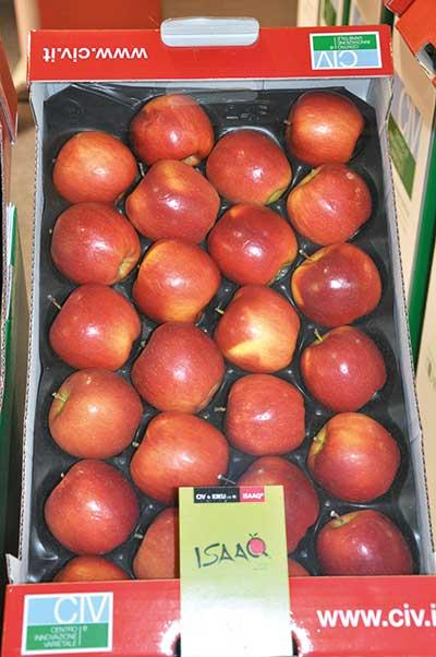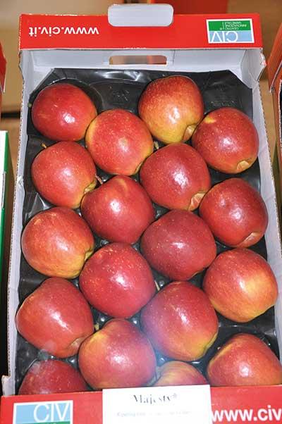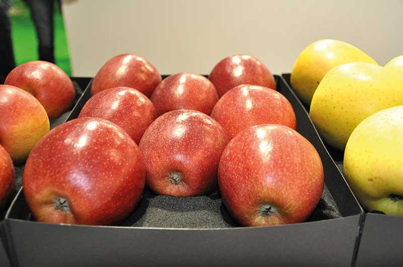 Tendencje w hodowli jabłoni zmierzają także do uzyskania odmian o zielonym lub ciemnobordowym zabarwieniu skórki – przekazała dr D. Kruczyńska. Do tej drugiej grupy kwalifikuje się ‘Isaaq’. Jabłka tej odmiany prawie w 100% wybarwiają się na ciemnobordowo. Pod kątem cech jakościowych zdecydowanie wyróżniały się z całej badanej grupy owoce odmiany ‘Majesty’ – były jędrne, o wysokim ekstrakcie i wyższej niż u ‘Gali’ kwasowości, wyrównane pod względem kształtu. ‘Renoir’ ma natomiast owoce podobne nieco do wybarwionego ‘Boskoopa’, ale o cieńszej skórce, mniej się ordzawiającej, bardzo słodkie (słodsze o jeden punkt od wzorca – ‘Golden Delicious’). Zaczyna owocować bardzo wcześnie, bo już w pierwszym roku po posadzeniu (w przypadku drzewek dwuletnich). Odmiana ‘Smeralda’ zaś nie będzie nadawała się w Polsce do produkcji jako odmiana o owocach zielonych – w naszych warunkach klimatycznych pokrywa się delikatnym łososiowym rumieńcem. Nawet siatki przeciwgradowe nie zapobiegną temu niekorzystnemu zjawisku – informowała dr D. Kruczyńska. Owoce odmiany ‘Sinfonia’ są natomiast dwubarwne (z czerwonym rumieńcem), kuliste.