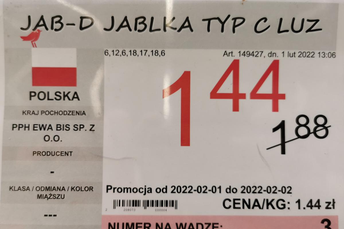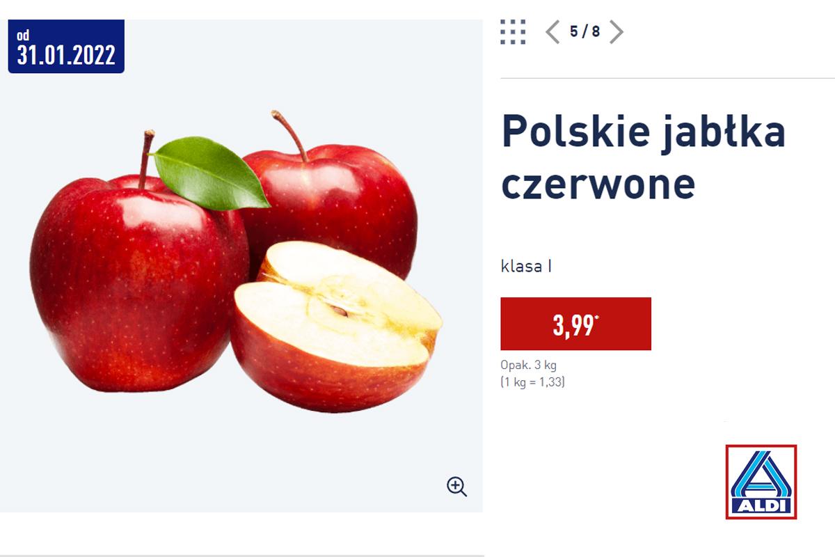 Jabłka w promocji oferuje między innymi Lidl. Cena detaliczna, jak widać niżej to 1,49 zł za kilogram. (Prawdopodobnie) najtańsze jabłka są oferowane przez krótki czas promocji przez sieć Aldi. Jak dowiadujemy się z gazetki, za 3 kilogramowe opakowanie klienci płacą 3,99 zł za kilogram co daje 1,33 zł za kilogram.