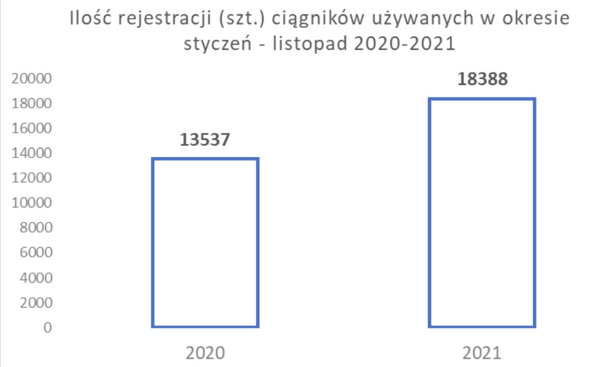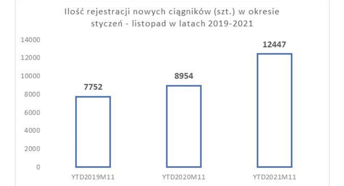W listopadzie tego roku zarejestrowano 1064 sztuk nowych ciągników. To mniej o 124 szt. niż przed miesiącem, ale to kolejny miesiąc, kiedy ilość rejestracji przekracza tysiąc sztuk. W sumie od początku roku zarejestrowano 12 447 sztuk nowych ciągników. To