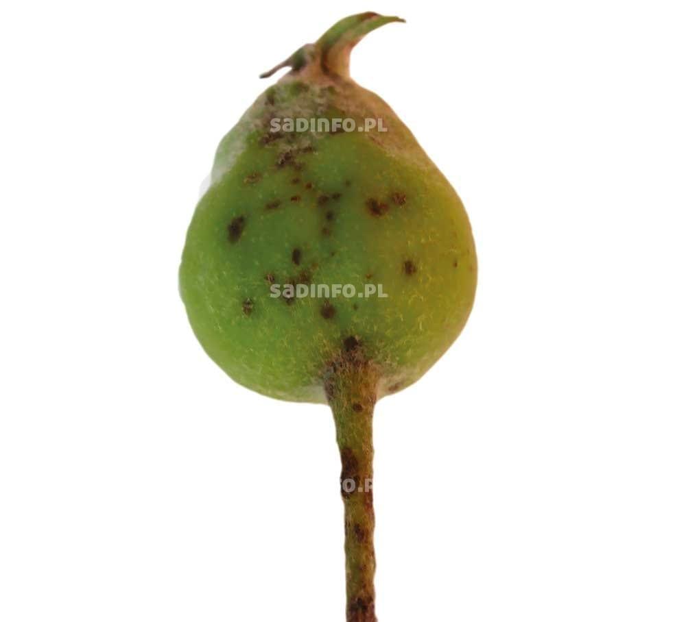 Kolejnym elementem decydującym o efektach ochrony jest prognozowanie, z jednej strony na podstawie nasilenia choroby w ubiegłym sezonie wegetacyjnym oraz przebiegu warunków pogodowych jesienią i zimą, a z drugiej na podstawie wskazań sygnalizatorów i programów symulacyjnych. Wielkość źródła infekcji pierwotnych w poszczególnych sadach jest ściśle uzależniona od stopnia porażenia liści przez V. inaequalis w poprzednim sezonie. Im porażenie liści silniejsze, tym wiosną źródło infekcji będzie większe. Dokładne lustracje sadów przeprowadzone jesienią przed opadnięciem liści są dobrym wskaźnikiem oceny stopnia zagrożenia na następny rok. Do wyznaczenia właściwego terminu rozpoczęcia ochrony chemicznej przed parchem niezbędne są obserwacje rozwoju owocników. Należy je rozpocząć już w lutym, aby sprawdzić, jak dużo owocników wykształciło się i jak postępuje proces ich rozwoju. Jest to wskaźnik informujący, kiedy należy spodziewać się pierwszych wysiewów zarodników workowych. Zwykle mają one miejsce w pierwszej dekadzie kwietnia, ale zdarzają się odstępstwa od reguły o dwa tygodnie wcześniej (np. sezon 2014) lub później (sezon 2013). W ostatnich dwóch latach zarodniki workowe osiągały dojrzałość do wysiewu wraz z ruszeniem wegetacji, stąd fala największych wysiewów i silnych infekcji przypadała na okres od fazy „pękania pąków” do „opadania płatków kwiatowych”. Objawy parcha obserwowano nie tylko na liściach (fot. 2) i zawiązkach (fot. 3), ale także w dużym stopniu na szypułkach i działkach kielicha (fot. 4). Ochrona w tym czasie powinna opierać się przede wszystkim na zabiegach zapobiegawczych lub przerywających infekcję, wykonywanych przed przewidywanymi opadami lub zaraz po nich, z wykorzystaniem (głównie) preparatów powierzchniowych. Zabiegi interwencyjne należy prowadzić tylko w sytuacjach koniecznych, przy bardzo dużej presji chorobowej, zwykle dla wzmocnienia ochrony zapobiegawczej. Dobrze przeprowadzona w tym czasie ochrona przed parchem jabłoni pozwala zwykle na ograniczenie liczby zabiegów, a co za tym idzie znaczne oszczędności w okresie infekcji wtórnych, po zakończeniu wysiewu zarodników workowych. Jest to bardzo ważne zwłaszcza dla tych producentów, którzy będą chcieli sprzedawać swoje owoce do dużych sieci handlowych. W wielu z nich już w tej chwili wymaga się obecności tylko 4 substancji aktywnych. Dlatego też im mniej zabiegów w drugiej części sezonu, tym większe prawdopodobieństwo, że zalecenia te uda się spełnić.