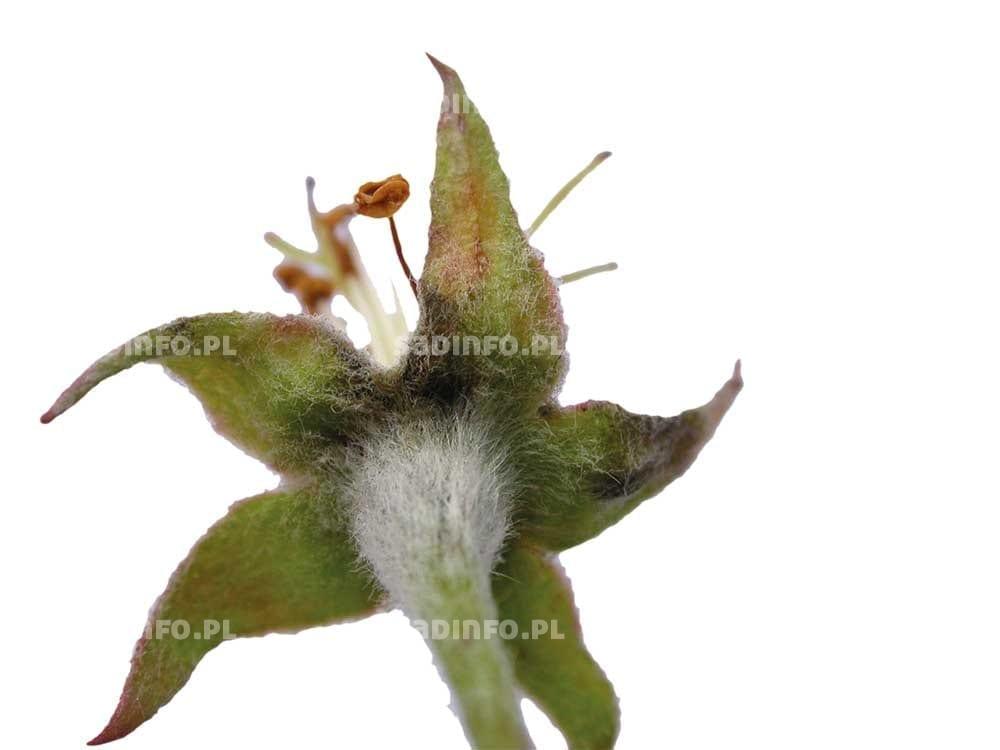 Na skutek zakażenia kwiatów jabłoni przez zarodniki Botrytis cinerea rozwija się mała plamka gnilna na zawiązkach owoców, u podstawy działek kielicha. Jednak jej rozwój zostaje szybko zahamowany, porażona tkanka zapada się i zasycha. Wokół kielicha pozostają ciemnobrązowe, suche, nekrotyczne plamy o średnicy 0,5–3 cm. Wystąpieniu tej formy szarej pleśni jabłek szczególnie sprzyja deszczowa pogoda w czasie kwitnienia i w okresie opadania płatków. Choroba może wystąpić na różnych odmianach jabłoni, ale najczęściej obserwowano ją na odmianach: ‘Gloster’, ‘Ligol’, ‘Alwa’, ‘Lobo’, ‘Paulared’. Infekcji kwiatów sprzyjają opady deszczu albo długo utrzymująca się poranna rosa, zwłaszcza w dużych, zagęszczonych koronach drzew. Największą podatność na zakażenie przez B. cinerea kwiaty wykazują pod koniec kwitnienia, kiedy płatki kwiatowe zaczynają opadać. Grzyb zasiedla słupki i pręciki, a także pozostaje w formie ukrytej w kielichu rozwijającego się jabłka. Dopiero podczas przechowywania następuje gnicie owocu, najpierw w części przykielichowej, a następnie zgnilizna obejmuje całą jego powierzchnię. Do zakażenia jabłek może dojść również w okresie przedzbiorczym i podczas zbioru, szczególnie jeżeli owoce są uszkodzone.