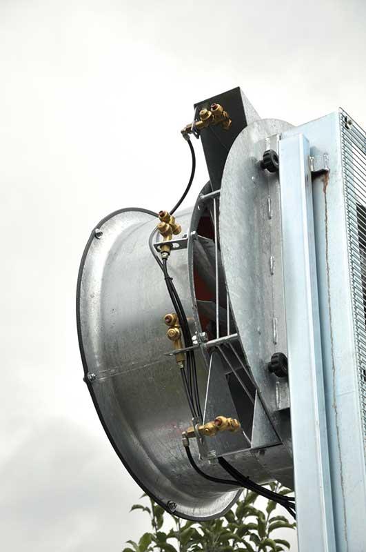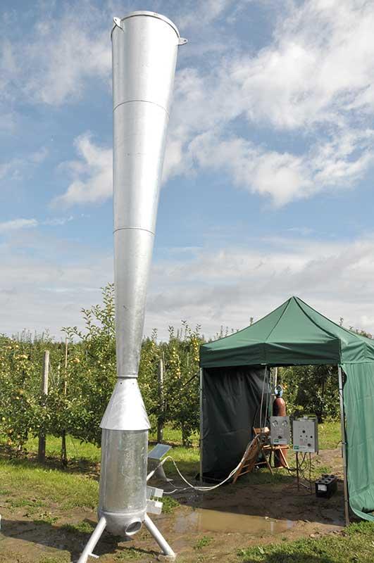Gradobicie jest dla sadowników jednym z najbardziej niebezpiecznych zjawisk atmosferycznych. Producenci owoców na różne sposoby próbują uchronić swoje uprawy przed jego skutkami. Firma Agro Partners z Warszawy, jako rozwiązanie tego problemu, a przynajmniej jego ograniczenie, proponowała zastosowanie w sadach działa przeciwgradowego (fot. 1) hiszpańskiej firmy S.P.A.G. Pomysłodawcą i konstruktorem urządzenia jest Fred Olivier (fot. 2), który podczas wilanowskiego spotkania zaprezentował jego działanie. Przy wykorzystaniu działa można zabezpieczyć przed gradem obszar o powierzchni 78–80 ha. Zasada działania urządzenia polega na spalaniu acetylenu i generowaniu co 7 sekund fali uderzeniowej, która przemieszcza się na wysokość 8–10 km, destabilizując gradziny. Urządzenie to należy uruchomić na około pół godziny przed spodziewanym opadem gradu. Zdaniem Macieja Kozarzewskiego z firmy Agro Partners, dzięki fali następuje zmiana struktury twardych kryształów lodu, które opadają na uprawę już w postaci deszczu lub śniegu, a nie gradowych kul. W ciągu godziny pracy działa zużywana jest butla acetylenu o pojemności 34 dm3. W zestawie jest sześć takich butli, co pozwala na prowadzenie ciągłej ochrony przez 5–6 godzin. Urządzenie zasilane jest przez panel solarny i akumulator. Ponadto firma oferuje zintegrowany z działem radar meteorologiczny, który w przypadku zagrożenia gradobiciem automatycznie uruchamia działo przeciwgradowe. Jeden radar może obsługiwać kilka lokalizacji dział w promieniu około 30 km. Koszt zakupu takiego urządzenia wynosi około 38 000 euro (netto). W opcji z radarem to dodatkowe 65 000 euro (netto).