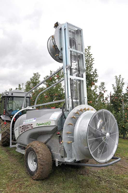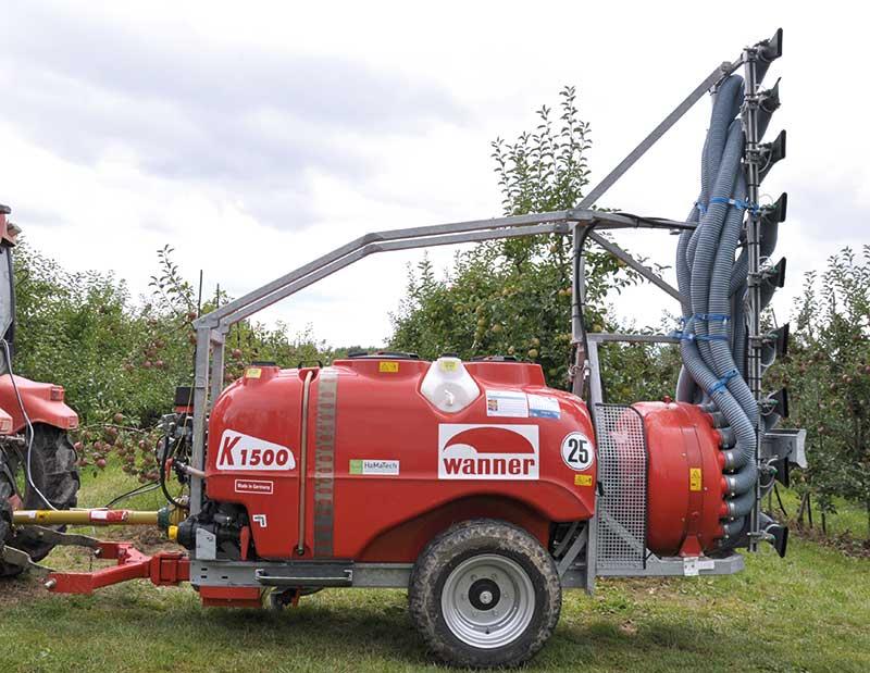 Z kolei firma HaMaTech zaprezentowała opryskiwacz K1500 (fot. 5) firmy Wanner. Wyposażony jest on w zbiornik o pojemności 1500 l, wykonany z żywic poliestrowych wzmacnianych włóknem szklanym. Jest on osadzony na ramie ocynkowanej ogniowo i wyposażony w dwa systemy mieszania (niskociśnieniowy i wysokociśnieniowy) oraz dwa wskaźniki poziomu napełnienia cieczy (rurowy i zegarowy). Maszyna o szerokości całkowitej wynoszącej 1,23 m przystosowana jest do pracy w sadach o międzyrzędziach od 3,5 m. Ponadto, równomierne rozprowadzanie cieczy roboczej w płaszczyźnie poziomej umożliwia turbina o wydajności od 19 500 m3/godz. (na pierwszym biegu) do 33 000 m3/godz. (na drugim biegu). Maszyna przystosowana jest do pracy w sadach o międzyrzędziach od 3 m. Do pracy z tym opryskiwaczem (sadownicy mogli zobaczyć pokaz jego pracy z różnymi typami rozpylaczy) wymagany jest ciągnik o mocy około 30 KM.
