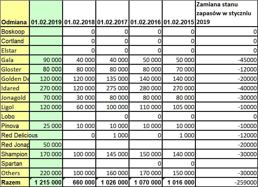 Po raz kolejny WAPA opublikowała dane dotyczące stanu zapasów jabłek w Europie na dzień 1 lutego 2019. Dane są publikowane z miesięcznym opóźnieniem (dane za marzec poznamy w pierwszych dniach kwietnia).