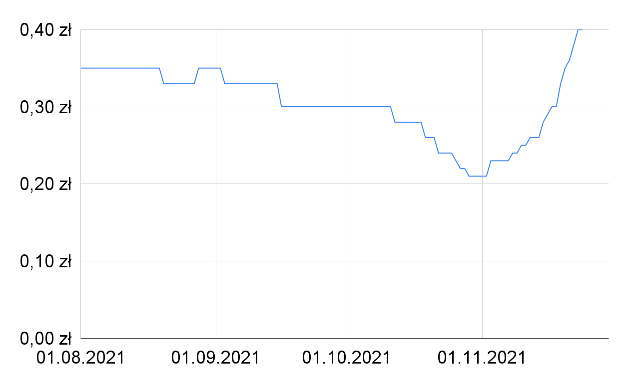 O sytuacji na rynku rozmawialiśmy z dyrektorem jednej z zachodnich firm. Ceny surowca, które wzrosły o ponad 100% w tak krótkim okresie czasu nie służą branży przetwórczej. – Prawda jest taka, że przez cały sezon mogliśmy skupować surowiec na poziomie 35 groszy, ale skumulowana podaż w drugiej połowie października zrobiła swoje – mówi nasz rozmówca. Dodaje, że gdy kupuje się tysiące ton na dobę i ma możliwość kupienia taniej to się z tego korzysta. Dlatego wykres ceny (widoczny niżej) wygląda tak jak wygląda...