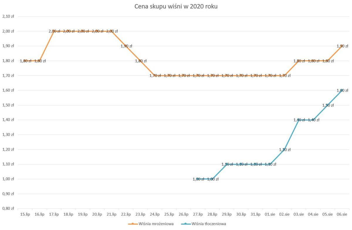 W przypadku wiśni na mrożenie wykres ceny jest znacznie bardziej statyczny. Przez wiele dni cena w całym kraju wynosiła w zdecydowanej większości punktów skupu 1,70 zł za kilogram. W tym tygodniu możemy zaobserwować delikatne wzrosty do 1,80 a następnie do oferowanej wczoraj miejscami stawki 1,90 zł za kilogram. Po niedzieli to mroźnie podniosły ceny zbytu. Warto jednak pamiętać, że to mniejsze firmy pośredniczące w handlu schodzą ze swojej marży oferując wyższe stawki w celu zdobycia nowych klientów. Jest to częstą praktyką w tym roku.