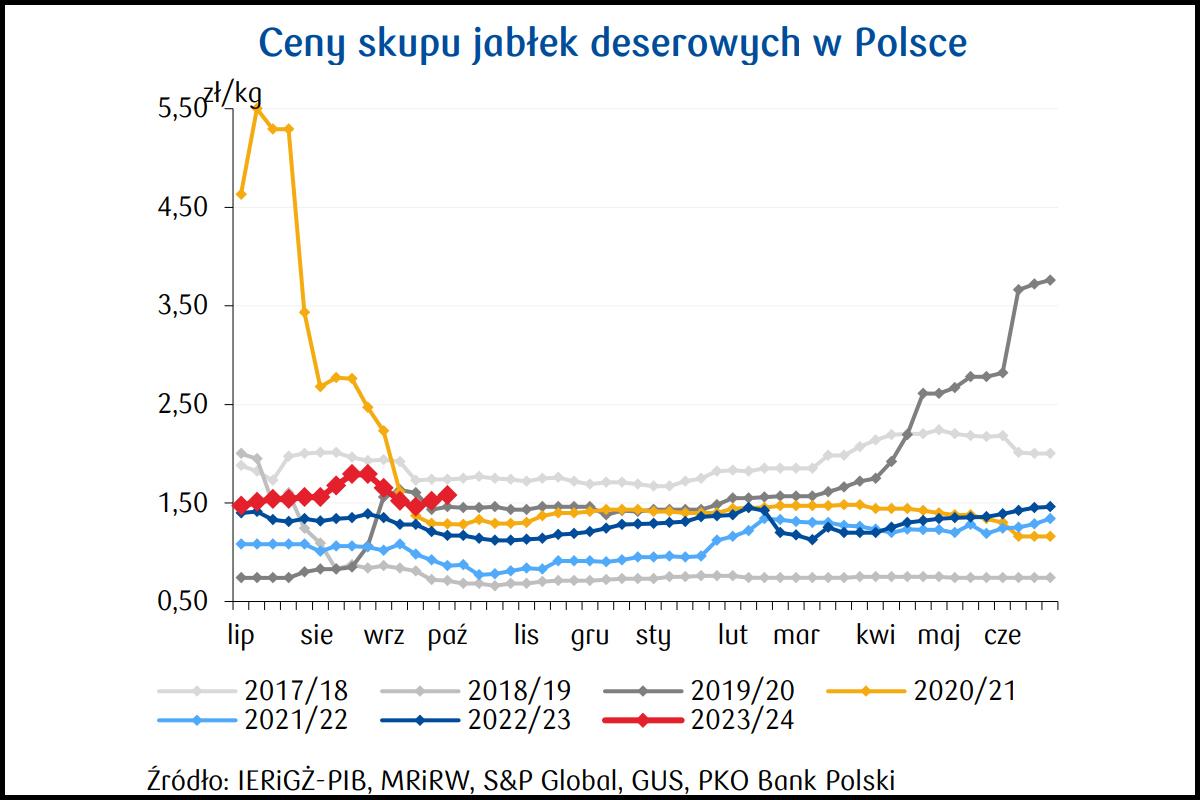 Zdaniem ekspertów, dynamika cen jabłek może utrzymać się na dodatnim poziomie do końca sezonu. Nawet pomimo tego, że notujemy trend spadkowy w przypadku ich konsumpcji. Za podwyżkami przemawiają niższe zbiory w Polsce, które przełożą się z pewnością na spadek zapasów w ujęciu rocznym w kolejnych miesiącach. Na ceny jabłek deserowych korzystnie będzie wpływał również zwiększony popyt w przetwórstwie, a także wzrosty cen importowanych owoców, między innymi pomarańczy (spadek zbiorów w UE).