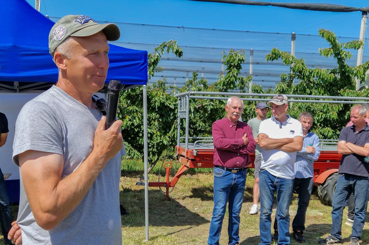 .Warsztaty poprowadził doradca z Wielkiej Brytanii, Leon Jahae, jednak na wstępie właściciel gospodarstwa, p. Janusz, opowiedział o swoich doświadczeniach z tym systemem prowadzenia drzew, a także odmianach, które uprawia (Staccato, Kordia i odmiany z serii Sweet). W sadach czereśniowych można dostrzec pierwsze dorosłe osobniki nasionnicy trześniówki. O progu szkodliwości, specyfice szkodnika oraz monitoringu opowiedział dr Michał Pniak z firmy Biocont Polska. Naukowiec przedstawił producentom czereśni zarówno biologiczne rozwiązanie do walki z nasionnicą trześniówką, a także nową i bardzo ciekawą strategię, która łączy ochronę chemiczną i biologiczną oraz charakteryzuje się bardzo dużą skutecznością.W momencie twardnienia pestki czereśni wchodzimy w okres budowania jakości plonu i średnicy owoców. Zarówno doradca z Wielkiej Brytanii, jak i Bartłomiej Drzazga z firmy Timac Agro podkreślali, że dziś odbiorcy coraz częściej oczekują owoców powyżej 30 mm średnicy o ciemnym i intensywnym wybarwieniu. Właśnie w tym kierunku należy dążyć w dokarmianiu owoców w okresie ich wzrostu. B. Drzazga opowiedział o nawożeniu drzew zarówno dolistnie, jak i poprzez fertygację.