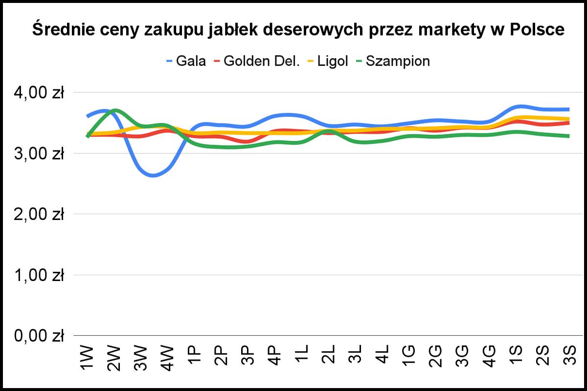 Jednym z symboli tego sezonu jest zamrożenie cen jabłek deserowych w handlu krajowym. Z niewielkimi zmianami były one praktycznie takie same przez 3 miesiące. Jak widzimy na wykresie niżej, początek 2025 roku przyniósł nieznaczne wzrosty dla Gali i Goldena.