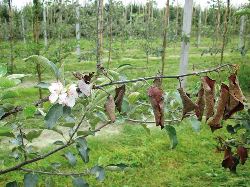 W ostatnich latach obserwujemy coraz częściej stosowaną praktykę późnego sadzenia drzewek wiosną, które przez to kwitną później, tzn. nawet na przełomie maja i czerwca. Tymczasem okresem najbardziej niebezpiecznym z punktu widzenia możliwości porażenia drzew jest właśnie kwitnienie (fot. 1). Ilość pierwotnego inokulum w tym okresie jest dużo większa niż na początku wiosny, dlatego porażone, dziko rosnące rośliny-gospodarze, ale nie tylko one, stwarzają wtedy nieporównanie większe zagrożenie, niż gdy kwitnienie ma miejsce wcześniej w sezonie.