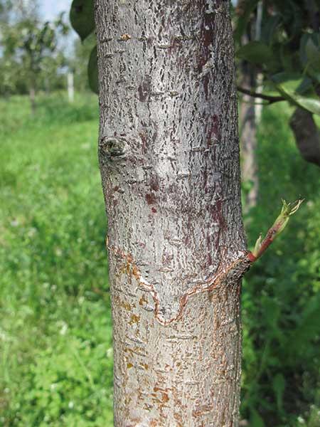 Naturalne otwory, takie jak miodniki czy znamię słupka, są głównymi „bramami” wejścia dla bakterii. Dlatego tak ważna jest eliminacja źródła choroby. Istotna jest przy tym podstawowa wiedza dotycząca diagnostyki, która częściowo może bazować na obserwowanych symptomach. Należy jednak podkreślić, że objawy zarazy (fot. 2–4) mogą być – w zależności od fazy fenologicznej i stopnia rozwoju choroby – podobne do objawów innych chorób, w tym chorób kory i drewna, powodowanych przez grzyby.