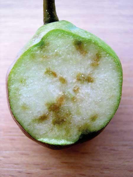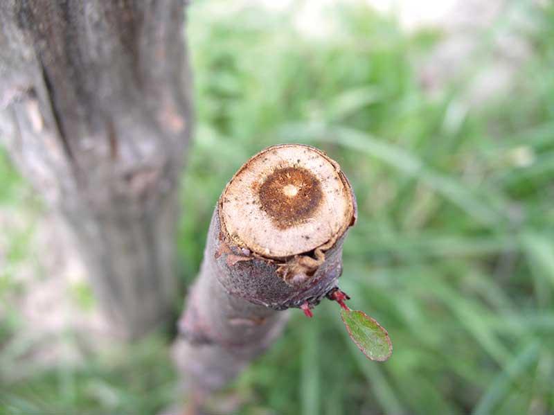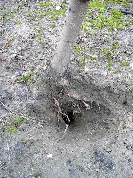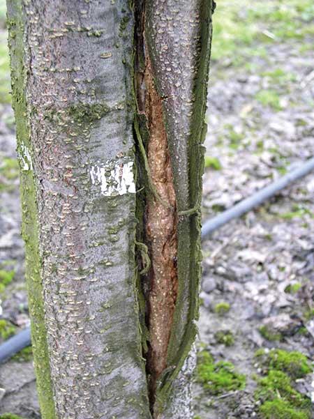 Uszkodzenie korzeni. W klimacie umiarkowanym, charakteryzującym się dużą zmiennością warunków pogodowych w sezonie wegetacyjnym oraz między latami, istotnym problemem w produkcji sadowniczej jest uszkodzenie systemu korzeniowego, przez niską temperaturę w zimie lub przez gryzonie (fot. 1). Niezależnie od przyczyny, ogranicza to aktywność korzeni w pobieraniu wody i składników mineralnych. W obu przypadkach na drzewach w sezonie wegetacyjnym pojawiają się objawy niedoboru większości składników, a szczególnie makroelementów. Ostrość ich niedoboru w roślinie zależy od skali uszkodzenia korzeni oraz szybkości ich regeneracji. Drzewa z uszkodzonym systemem korzeniowym powinny być zasilane dolistnie mocznikiem wraz z nawozami wieloskładnikowymi zawierającymi mikroelementy.