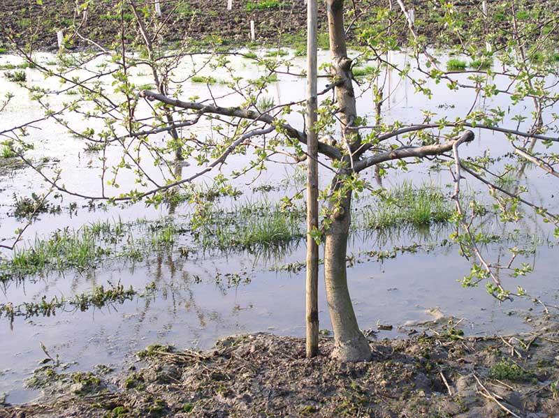 Stres tlenowy. Czynnikiem uzasadniającym nawożenie drzew przed kwitnieniem, bezpośrednio po opadnięciu płatków kwiatowych oraz w okresie początkowego wzrostu zawiązków owoców są intensywne deszcze powodujące podtopienia (fot. 3). W tych warunkach na roślinach pojawiają się najpierw objawy niedoboru żelaza i manganu, a w następnej kolejności innych składników (najczęściej azotu, magnezu i potasu).