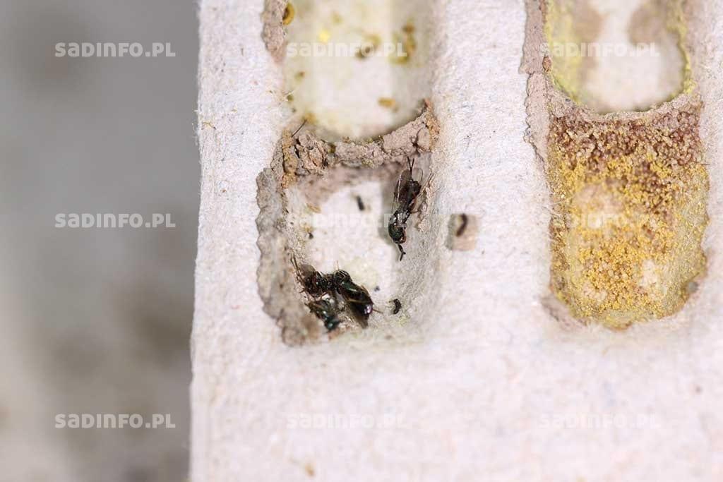 W naszym klimacie, w koloniach murarki ogrodowej, występuje kilka gatunków pasożytów. Do głównych, mających największy wpływ na redukcję kolonii, należą: roztocz – Chaetodactylus osmiae (fot. 2), pasożytnicza osa – Monodontomerus spp. (fot. 3) i muchówka – Cacoxenus indagator (fot. 4). Pozostałe pasożyty mają mniejsze znaczenie.