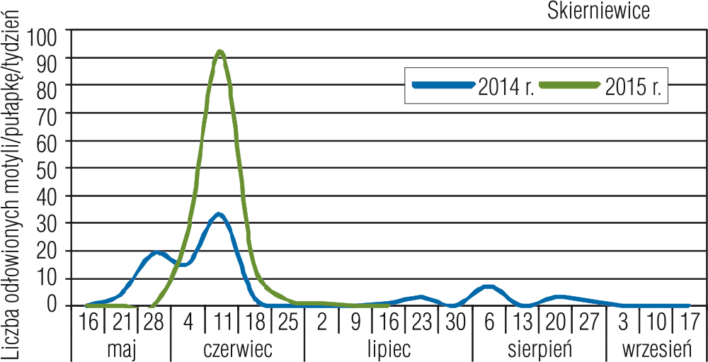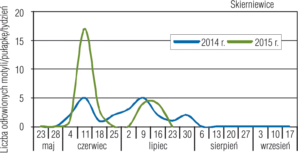 W ostatnich sezonach letnie (drugie) pokolenia dwupokoleniowych gatunków zwójkówek liściowych, które decydują o poziomie uszkodzeń owoców, były mniej liczne lub w ogóle ich nie notowano. Z tego powodu podczas zbiorów, liczba jabłek uszkodzonych przez gąsienice była niewielka. Trudno jest przewidzieć, jak będzie w bieżącym roku, ale tej grupy szkodników nie można lekceważyć. Na podstawie dotychczasowych obserwacji można stwierdzić, że w tym sezonie liczebność zwójkówek liściowych jest większa. Liczba motyli odławianych w pułapki feromonowe jest często dwukrotnie wyższa niż to miało miejsce w analogicznym okresie roku ubiegłego (rysunek 1, 2).