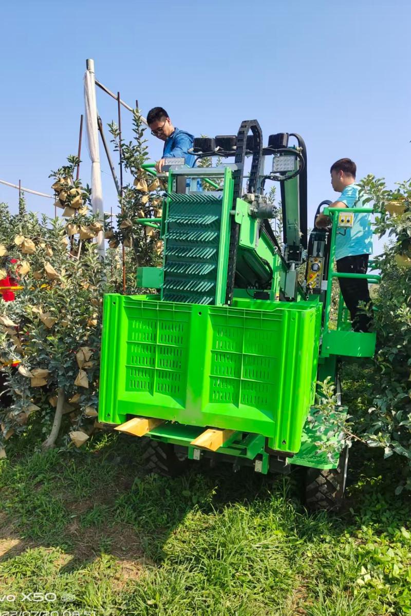 Dziś przedstawiamy znacznie bardziej skomplikowaną i droższą maszynę – kombajn do zbioru jabłek deserowych. Na zdjęciach widzimy wyraźną inspiracje europejskimi maszynami. Cztery osoby zrywają jabłka z poziomu gruntu, a kolejne cztery z balkonów. Widzimy główną taśmę i identycznie skonstruowany mechanizm do wykładania jabłek do skrzyniopalet.