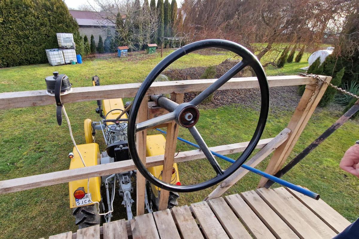 Kierownica została osadzona na frontowej balustradzie platformy i pozwala na regulowanie układem kierowniczym Ursusa. Celowo nie został zastosowany jeden długi, sztywny profil łączący kierownicę ciągnika i tę pochodzącą od Tarpana. Ciągnik wraz z platformą pracuje w różnym terenie, często nierównym i z dziurami. Zastosowanie dwóch rur, z których jedna wchodzi w drugą i nie jest zespolona na stałe powoduje, że taka konstrukcja może wybierać nierówności. Rury rozsuwają się względem siebie w zależności od kąta nachylania ciągnika i przyczepy.