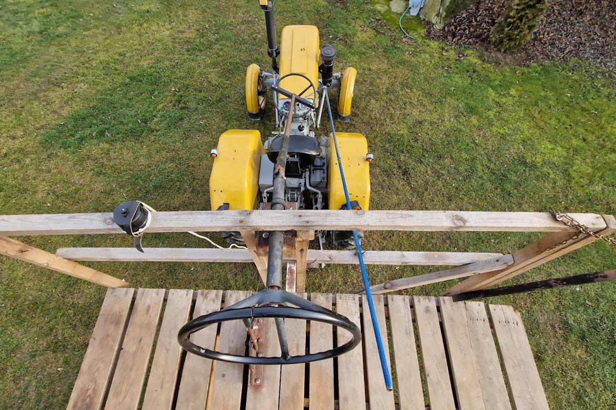 Po wykonaniu pracy możliwe jest przestawienie ciągnika i przejazd pod kolejne cztery drzewa. Platforma pozwala bowiem na włączanie i wyłączanie z niej silnika. Na frontowej barierce został zamontowany także starter pochodzący z innego Ursusa C-330. Długi przewód elektryczny został wyprowadzony do stacyjki ciągnika. Pozwala to na uruchomienie maszyny z platformy. Musi być jedynie wciśnięty kluczyk. Do wyłączenia silnika Ursusa niezbędna jest dźwignia obrotów silnika. Proste rozwiązanie pozwala dokonywać tej czynności z platformy. Wystarczył do tego długi pręt, który został zespolony z dźwignią obrotów przy kierownicy ciągnika. Wyciągnięcie w kierunku przyczepy pręta powoduje wygaśnięcie silnika.