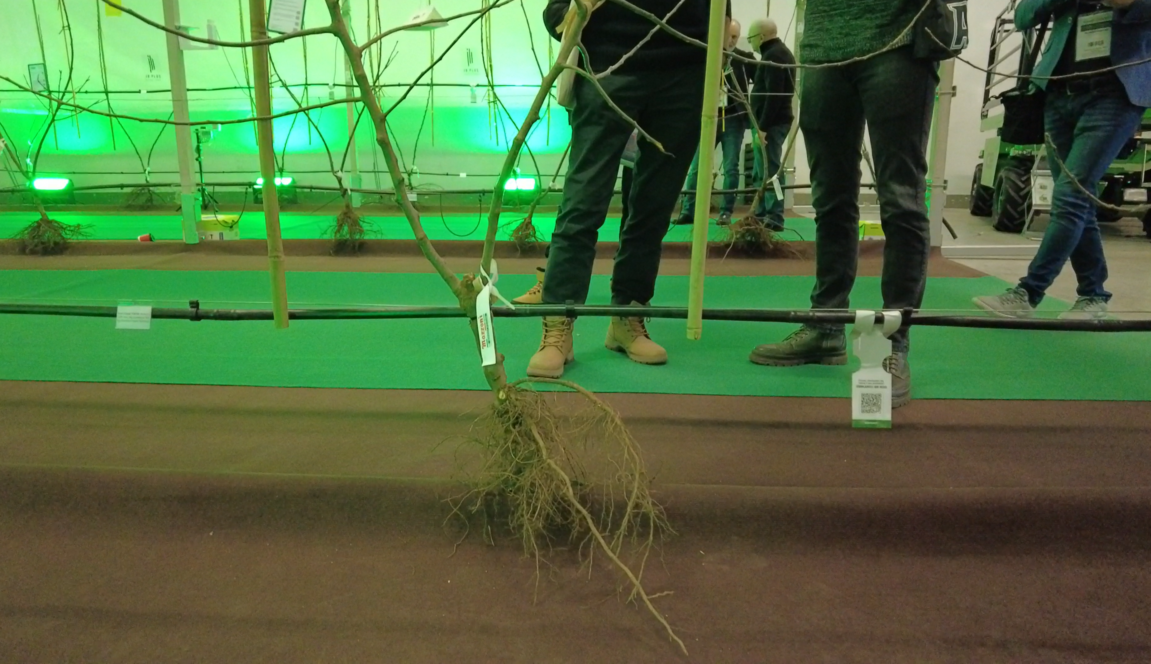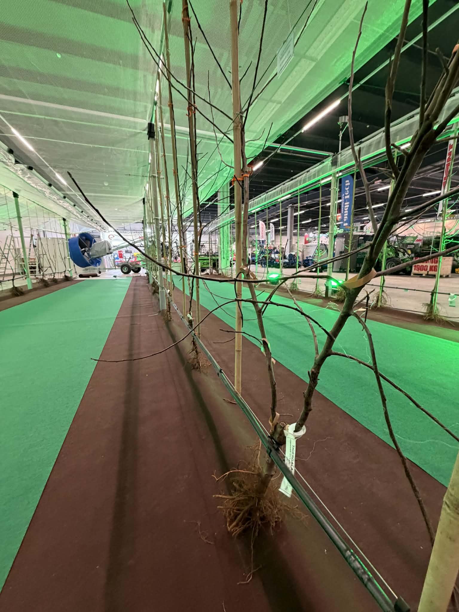 W drugim rzędzie jabłoni posadzono drzewka w systemie Bibaum, dostarczone przez włoską szkółkę Mazzoni. Były to: Fuji San – podkładka M9 T337 oraz TigerGala – na podkładce Geneva G11. Fuji w polskich warunkach dojrzewa późno. Zbiór tej odmiany przypada zazwyczaj na przełom października i listopada. Tak późny termin zbioru może rodzić problemy z uzyskaniem optymalnej dojrzałości, zwłaszcza przy mokrej i chłodnej jesieni. Dotyczy to również uuzyskania odpowiedniego wybarwienia. Znacznie większe zainteresowanie odbiorców wzbudzała Tiger Gala – sport Gali o bardzo wyraźnym prążkowaniu i intensywnym rumieńcu. Odmiana ma atrakcyjny wygląd, co według Marcina Piesiewicza czyni ją szczególnie pożądaną na rynkach dalekich, takich jak Indie i inne kraje azjatyckie. Mocne wybarwienie, kontrastowy prążek i stabilny kolor to cechy wysoko cenione przez tamtejszych importerów.