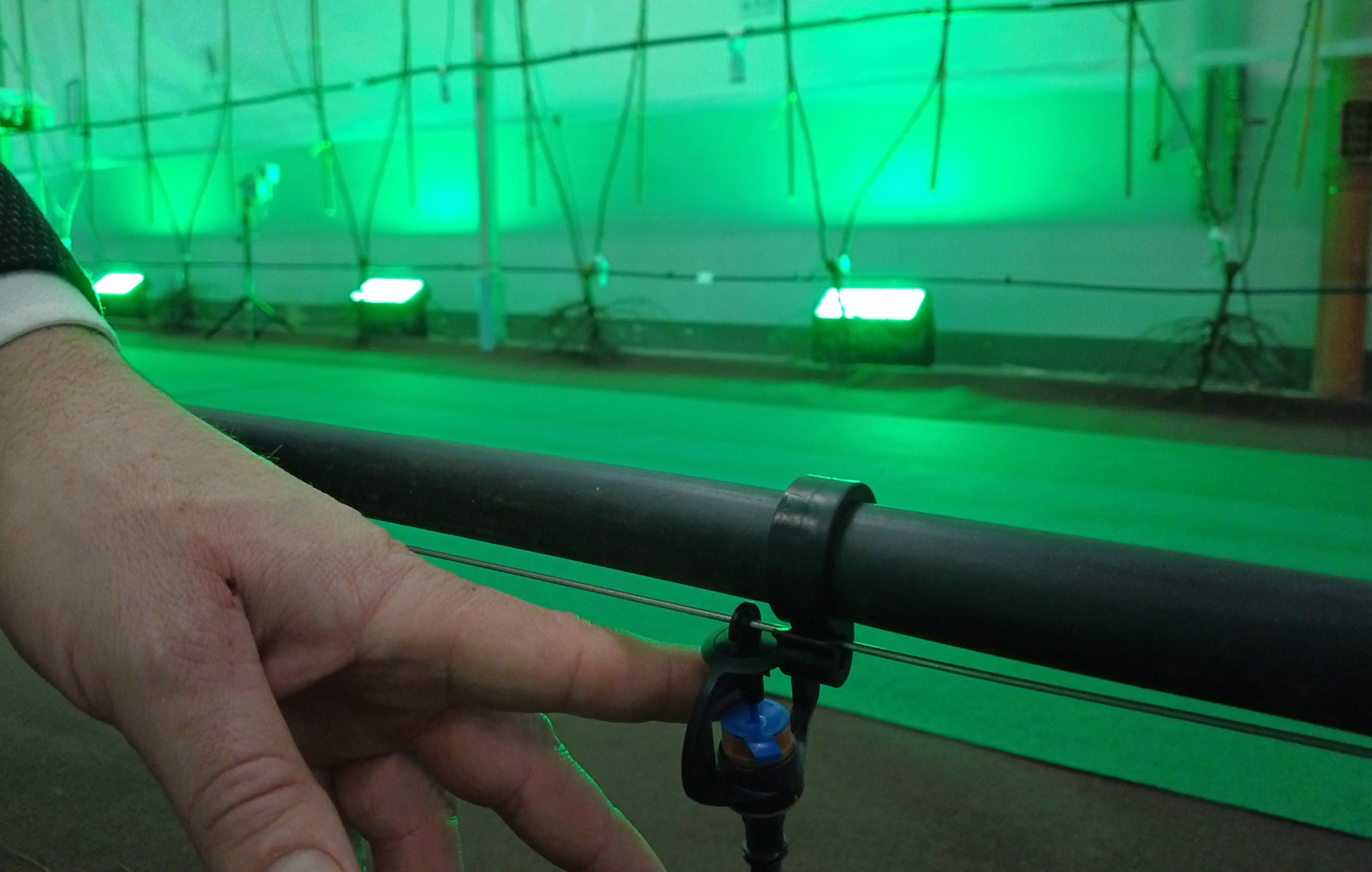 W rzędzie grusz zainstalowano system antyprzymrozkowy typu Flipper (Agrosimex). System ten zrasza tylko obszar nad rzędami, a nie całą powierzchnię kwatery. Zapotrzebowanie na wodę jest w takim systemie wyraźnie niższe – około 16 m³/ha zamiast 30 m³/ha, jak w przypadku klasycznych zraszaczy pełnoobrotowych.