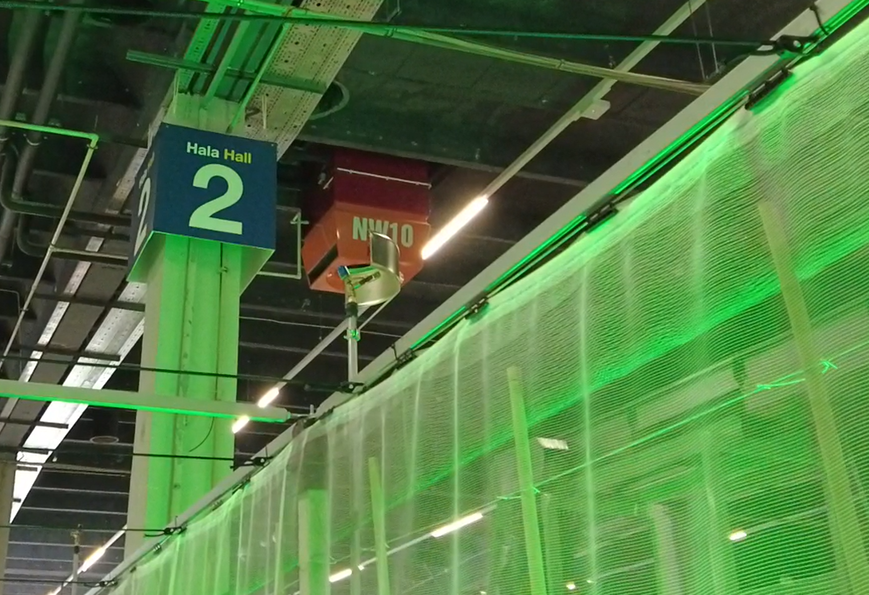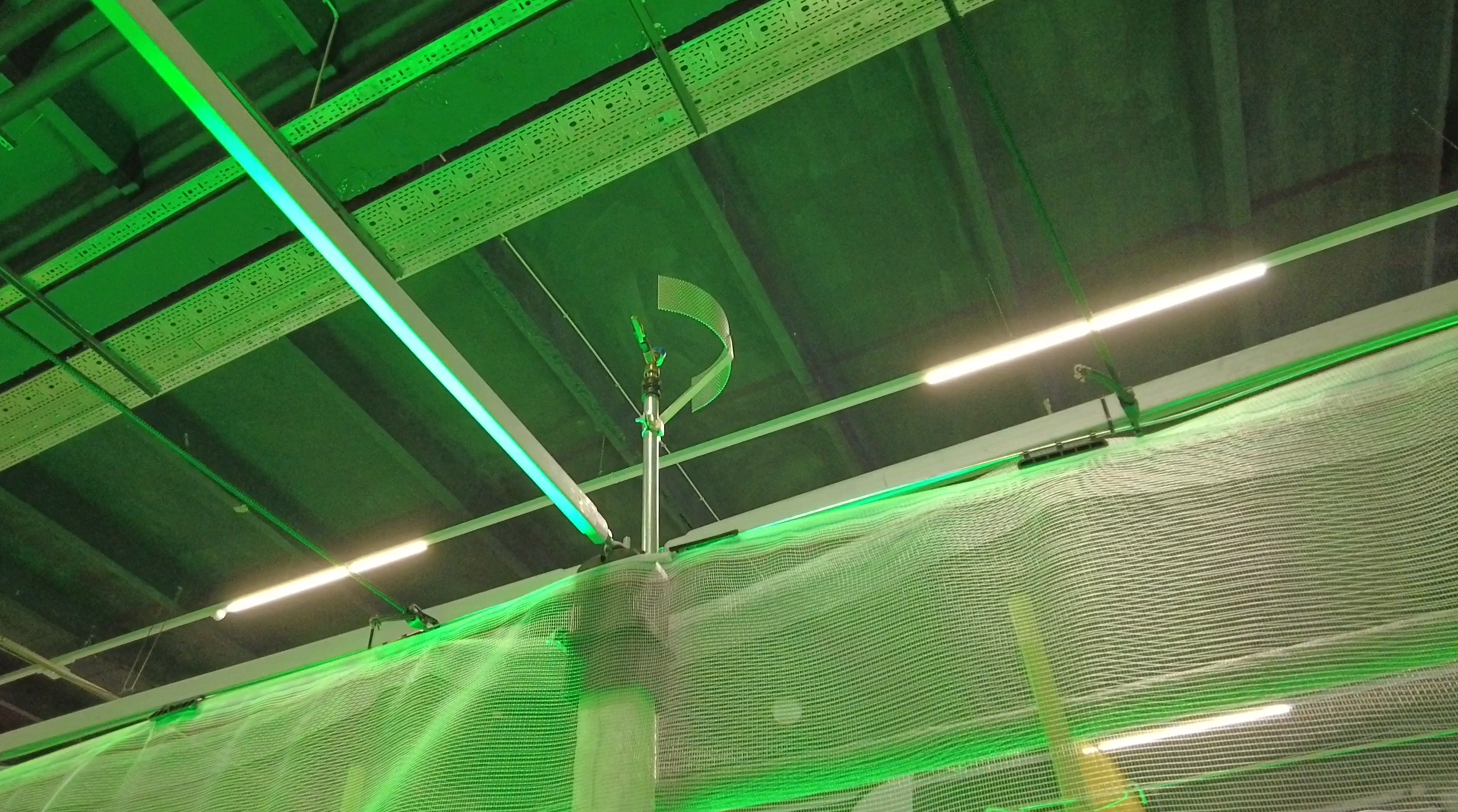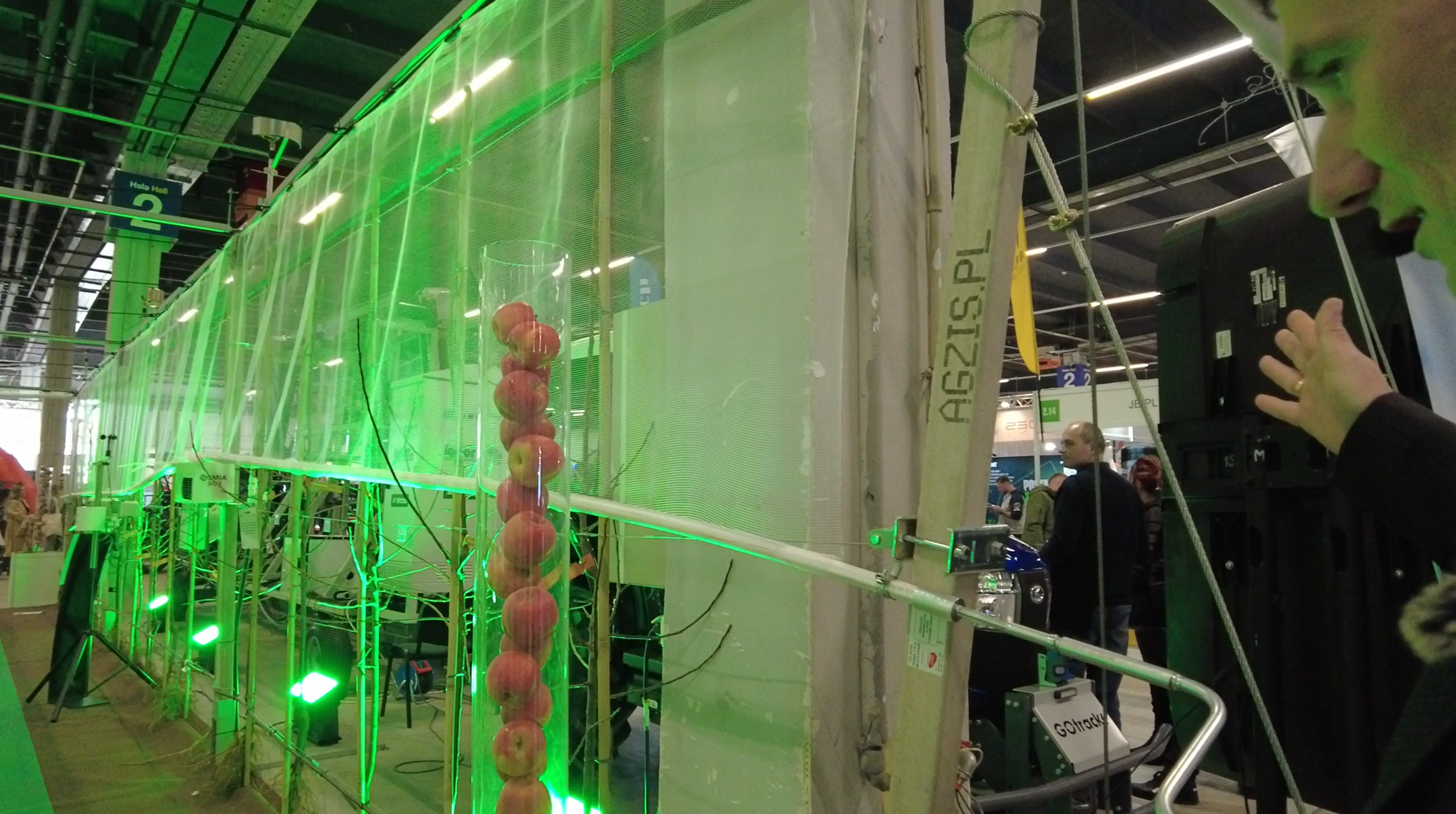Nad pierwszym rzędem jabłoni zaprezentowano system przeciwgradowy Whailex, produkowany i montowany przez firmę JB Plus (DESZCZ + GRAD). To rozwiązanie przeznaczone przede wszystkim do wąskich kwater, gdzie trudno jest zastosować klasyczną konstrukcję z ściągami górnymi. W tym systemie siatka prowadzona jest po obu stronach rzędu i zwijana bądź opuszczana za pomocą korby. Dzięki temu jedna–dwie osoby są w stanie w krótkim czasie rozwinąć okrycie przed zapowiadanym gradem albo je podnieść, gdy chcemy lepiej doświetlić drzewa lub wykonać zabiegi.