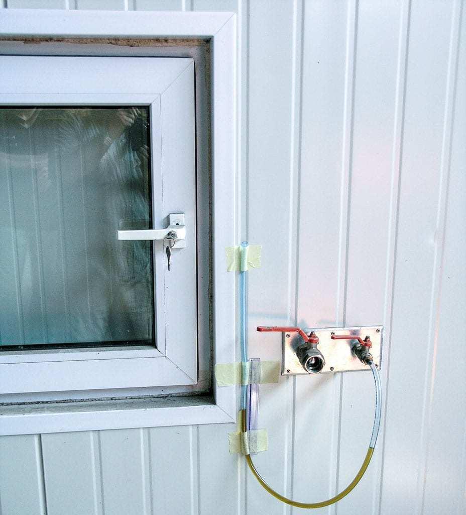 Test taki powinien być przeprowadzony w każdej gazoszczelnej komorze przed wstawieniem do niej owoców. Mogą przeprowadzić go sami sadownicy lub można powierzyć to zadanie firmie chłodniczej. Testy można wykonywać na nadciśnieniu lub podciśnieniu. Wykonują go zwykle 3 osoby. Jedna pozostaje na zewnątrz, a 2 wchodzą do środka komory. Komorę szczelnie zamykamy, a następnie wypompowujemy powietrze odkurzaczem, przez co powodujemy różnicę ciśnień maksymalne do 25 mm słupa cieczy. Ustalamy takie ciśnienie, wykorzystując i skalując przezroczysty przewód ukształtowany w postaci U-rurki przytwierdzony do drzwi komory (fot. 3). Jeden z jej końców montujemy do króćca znajdującego się w drzwiach komory, a do drugiego nalewamy wodę. Na skutek wypompowywania powietrza następuje różnica poziomów wody. Po uzyskaniu różnicy wynoszącej 20–25 mm słupa wody, przerywamy wypompowywanie powietrza i obserwujemy spadek ciśnienia. Szczelność jest wystarczająca, jeśli w czasie 1 godziny poziom wody nie spadnie poniżej 10 mm. W razie stwierdzenia nieszczelności, osoby w komorze powinny najpierw je odszukać, zaznaczyć, następnie należy rozszczelnić komorę, usunąć nieszczelności i ponownie przeprowadzić próbę szczelności.