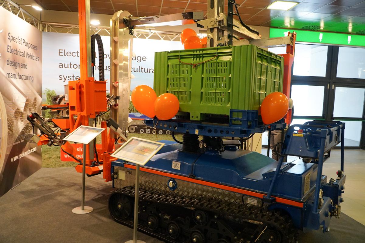 Ciekawe rozwiązanie - robota do zbiorów jabłek zaprezentowała również firma pochodząca ze Słowenii. Slopehelper - bo tak nazywa się robot, jak na razie jest w stanie zebrać jedną skrzynię w ciągu godziny. Jednak jak wyjaśniała nam przedstawiciela firmy, w tym momencie maszyna wyposażona jest w jedno ramie, ale w przyszłym roku zamontowane zostaną dodatkowe 3 ramiona. Maszyna jest elektryczna - pełne ładowanie wystarczy na 8-14 godzin pracy. Maksymalna prędkość maszyny to 10 m/h. Porusza się na gąsienicach, żeby lepiej radzić sobie w błocie i na grząskim gruncie. Prototyp jest ciągle ulepszany na podstawie opinii sadowników, którzy mają szansę testować go w swoich sadach. W przyszłym sezonie w sadach będzie testowane rozwiązanie z 4 ramionami. Nie ma tu pneumatyki, lecz najprostsze rozwiązanie mechaniczne. Ramie ma dwie ruchome końcówki, które działają podobnie do dwóch ludzkich dłoni chwytających jabłko.