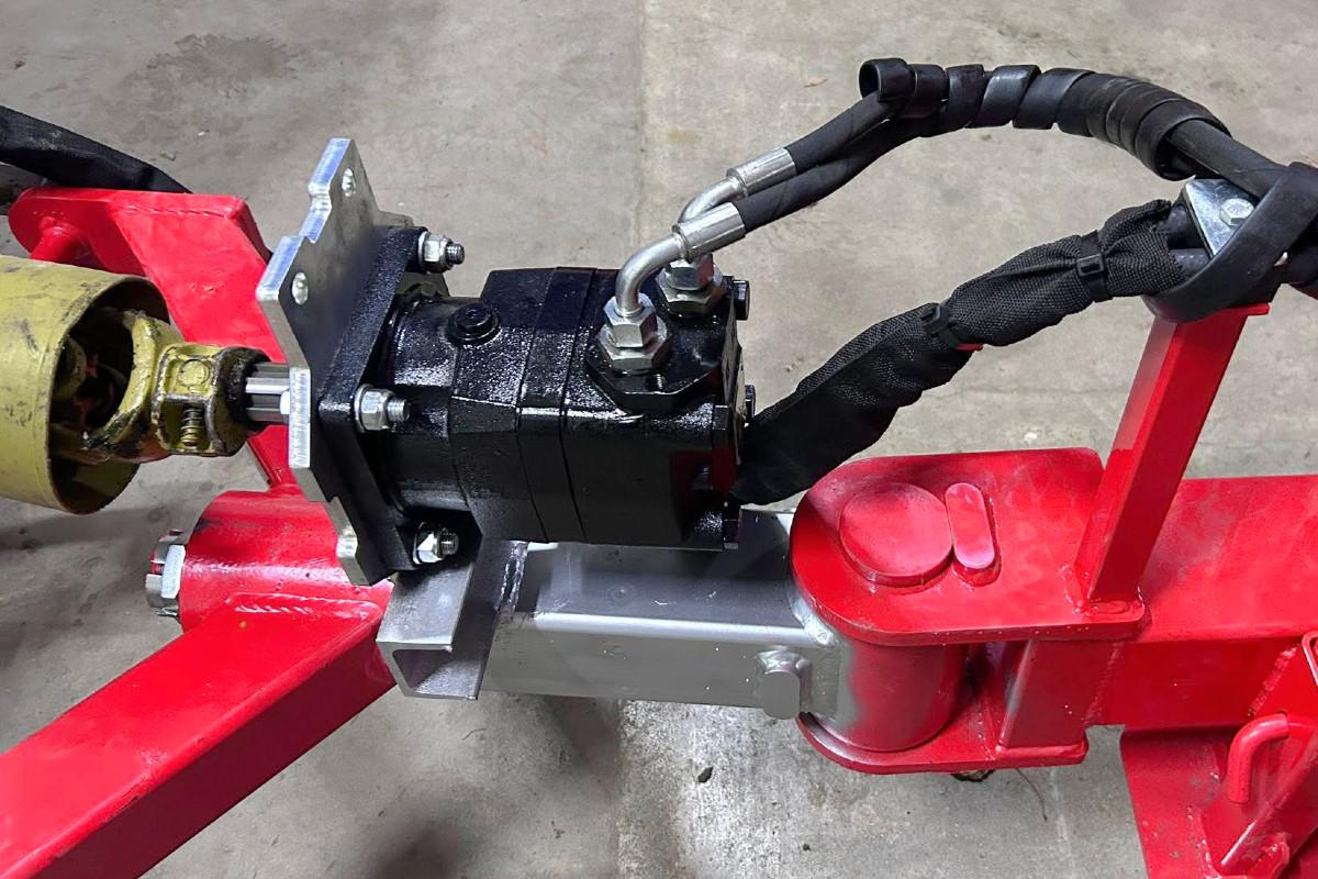 Najdroższym elementem jest silnik hydrauliczny montowany za wałkiem. Daje on szereg zalet. Po pierwsze, w zasadzie rozwiązuje kwestię hamowania. Jeśli zgasimy silnik to traktor z platformą nie zsunie się ze wzniesienia do przodu lub do tyłu. Ponadto wyłączenie sterowania jest błyskawiczne i banalnie proste. Wystarczy wyłączyć wałek zależny w ciągniku i możemy wracać do domu drogami publicznymi.